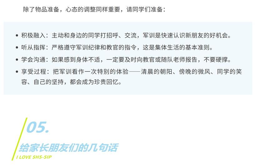学校已经在安全、卫生、医疗等方面做好了充分准备,我们会像守护自己的孩子一样守护他们。也期待您与我们携手,提前帮助孩子准备好所需物品,关注他们的身体状态,让他们带着健康、安心与自信,迎接这段难忘的军训时光。