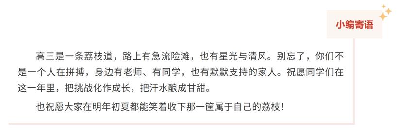 新学期,就是新的任务。把这份“荔枝”认领下来吧!把它当作属于自己的责任与目标。或许路上会很辛苦,但甘甜也正在终点等着我们。高三起航,让我们一起全“荔”以赴!