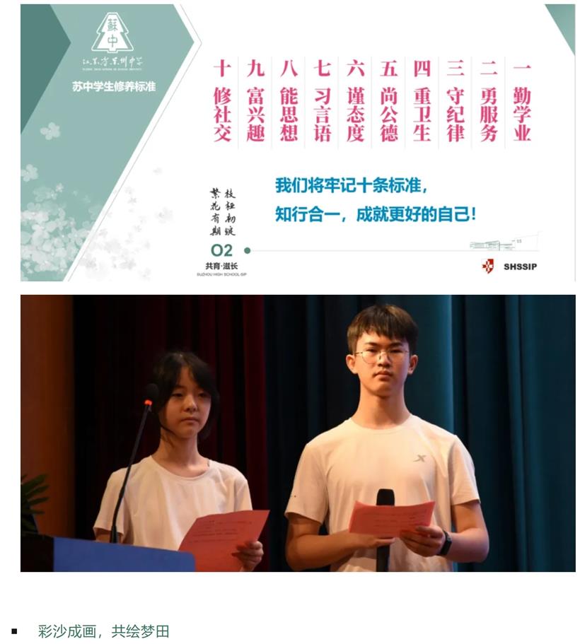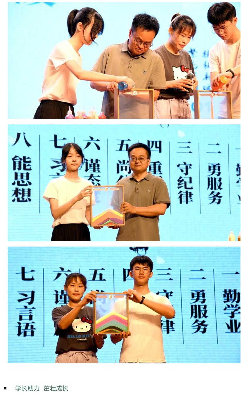 初一级部主任沈晨老师与新生代表初一 (6)班明睿涵同学,高一级部主任施菲菲老师与新生代表高一(1)班竹林同学,共同将象征梦想的彩沙倒入画框。这些彩沙,每一瓶都代表着《苏中学生修养标准》的一个品质。它们看似独立,但当它们交融在一起时,便会化作滋养成长的沃土,成为“梦田”。而这片“梦田”也将成为你们未来三年共同的成长印记,以十项修养标准为养分,让梦想在这片田地里抽枝展叶,终成繁花!