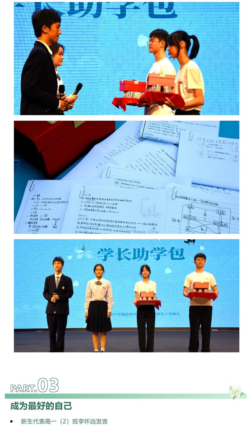 在成长的道路上朋辈互助,学长是新一届学子的引路人。高三钱学森(1)班的优秀学姐管玥涵同学和初三(5)班的优秀学长刘珂宇同学,向新生代表赠送“成长加油包”。他们的礼物中有学霸笔记、错题集、学习集锦和园区校成长密码。还有一份特别的“花种盲盒”,愿新一届同学播下希望的种子,收获未来的繁花!