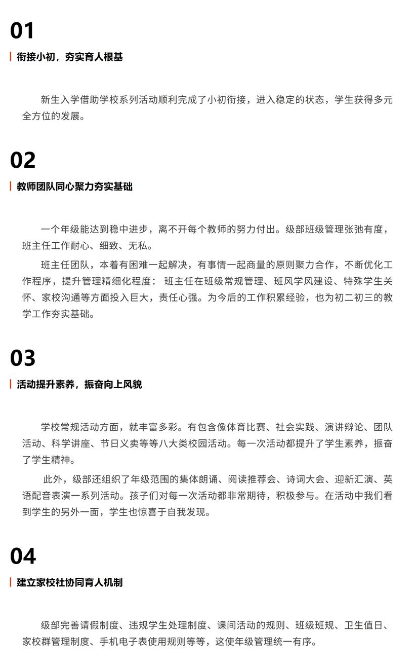 上学期,初一年级部在学校党委、行政班子的坚强领导和各部门的鼎力支持下,始终秉持“立德树人”根本任务,紧密围绕“夯实基础、规范行为、激发潜能、平稳过渡”的工作主线,全体教师精诚团结、锐意进取,克服了诸多困难,取得了显著成效: