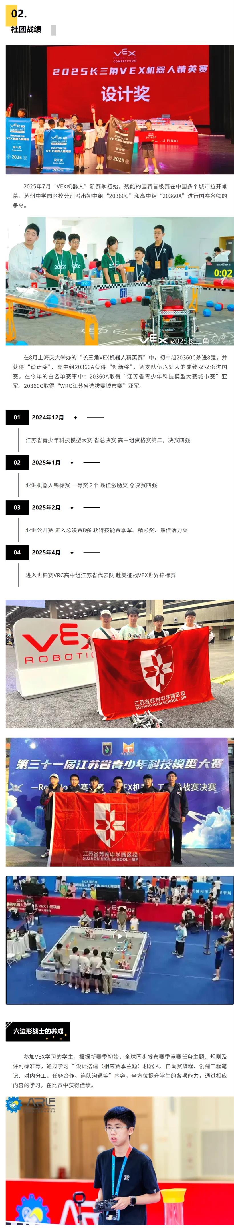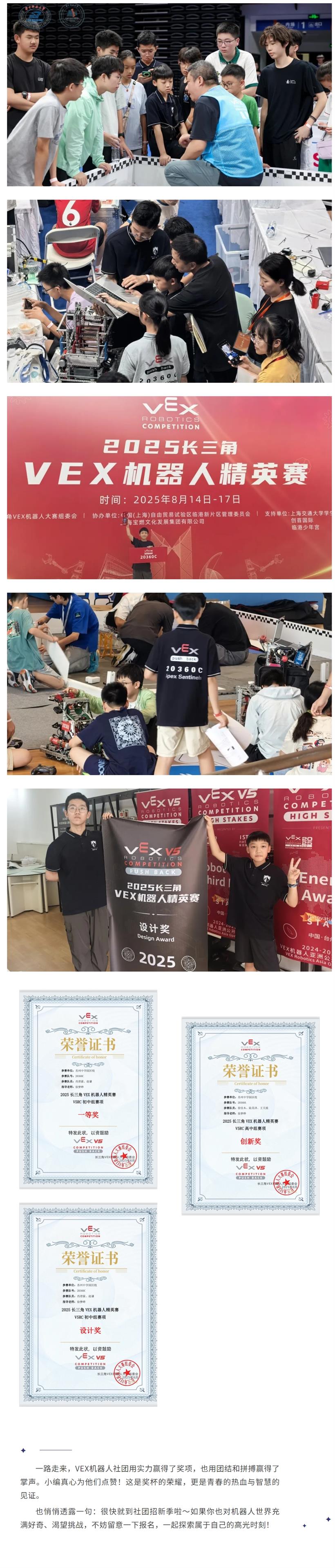 在过去的一年里,苏州中学园区校VEX机器人社团凭借实力与默契一路过关斩将。初中组“20360C”在上海交大“长三角VEX机器人精英赛”中闯进八强,勇夺“设计奖”;高中组“20360A”凭借独特思路摘得“创新奖”。他们更在白名单赛事中双双斩获亚军,用一场场硬仗证明了园区校学子的智慧与坚韧。