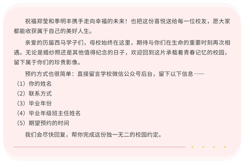还记得2023年中秋节,学校正式宣布:“毕业的历届西马学子,欢迎你们在人生的幸福时刻回到校园,留下最美好的影像。”