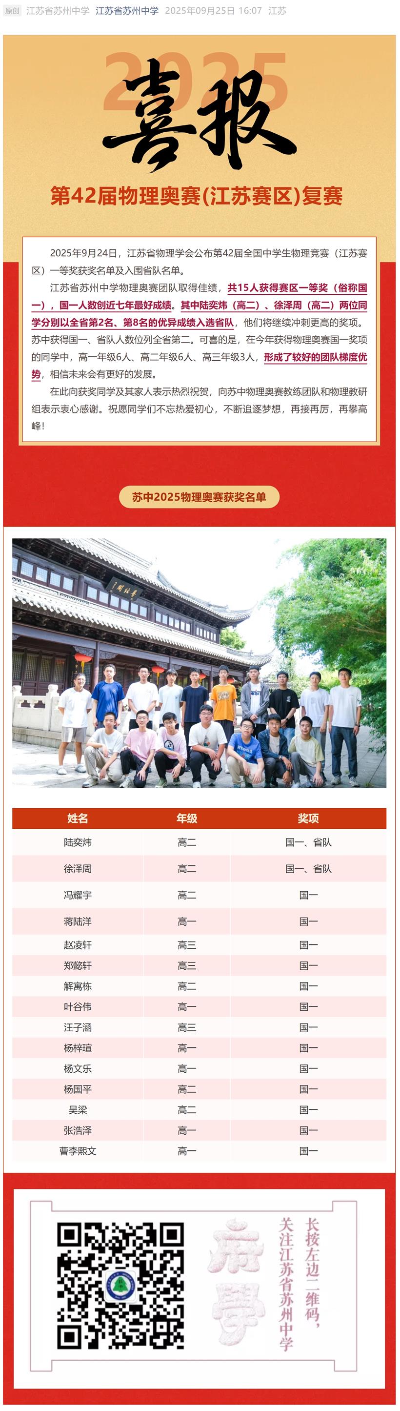 15人国一,2人省队,苏中物理奥赛团队未来可期!