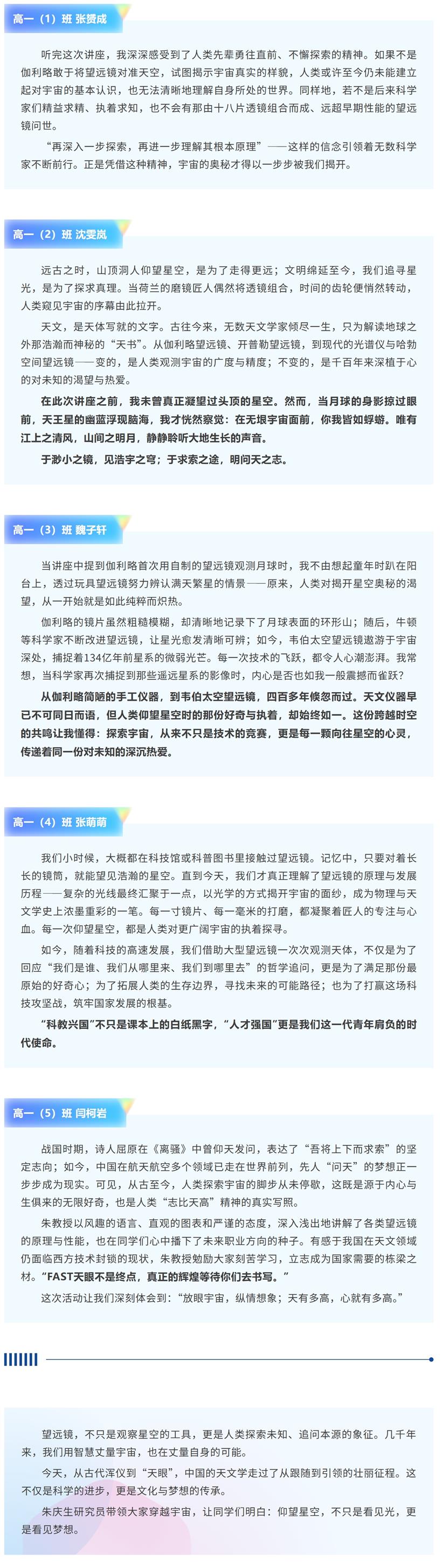 朱庆生研究员的讲述,不仅带我们走过了几千年的天文发展史,也让我们看见了中国望远镜从无到有、从落后到引领的壮丽进程。望远镜背后,不只是科技的进步,更有无数探索者仰望星空、执着追梦的故事。这段历史,引发了同学们心中的思考与感动。