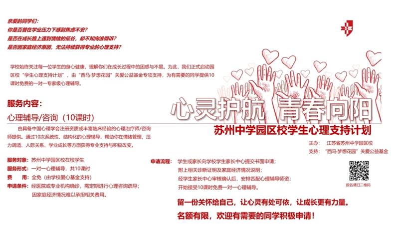 为了更好地支持大家,我代表学校心理团队,正式推出两项由学校与“西马·梦想花园”公益基金共同支持的心理关怀计划: