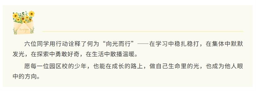 这六位同学,是否符合“阳光少年”这一称号呢?他们的行动,是否足以成为同龄人的榜样,成为校园中耀眼的阳光?在小编看来,他们不仅以积极向上的生活态度赢得了这份认可,更在各自的领域中,通过日复一日的努力和坚持,展现了勇气、责任和温暖。