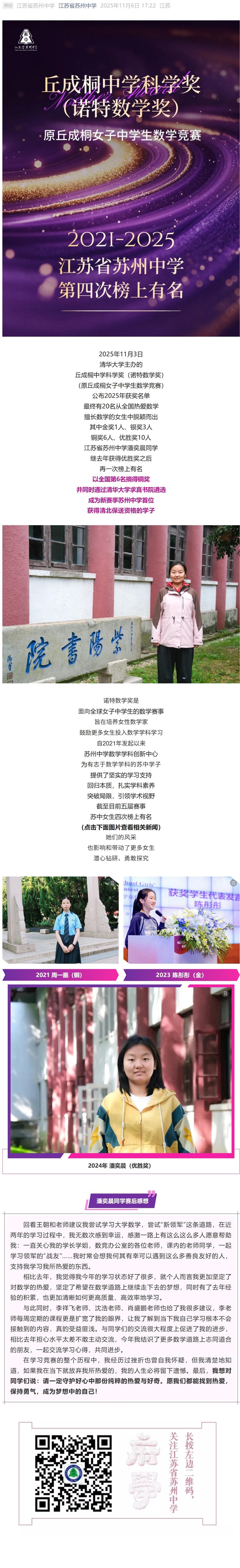 喜报!苏州中学女生获得丘成桐中学科学奖,全国第6名!