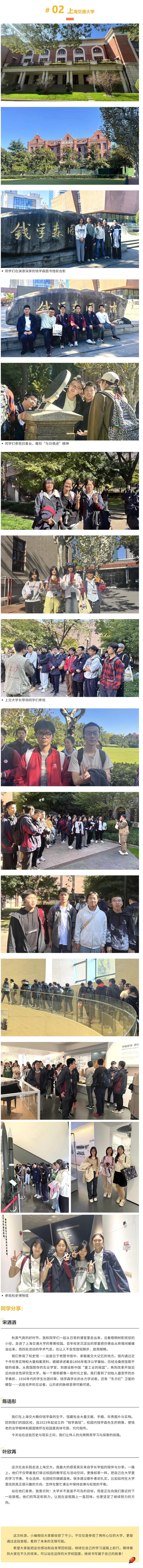 期中考试结束,大家期待已久的秋游活动如约而至!高一年级的同学们走进了苏州大学,漫步在百年钟楼前的林荫道,细细品味着方塔红砖间流淌的百年文脉;高二与高三的同学们则前往上海交通大学,穿行在典雅的哥特式图书馆前,仰望着“思源门”所承载的深远意义。