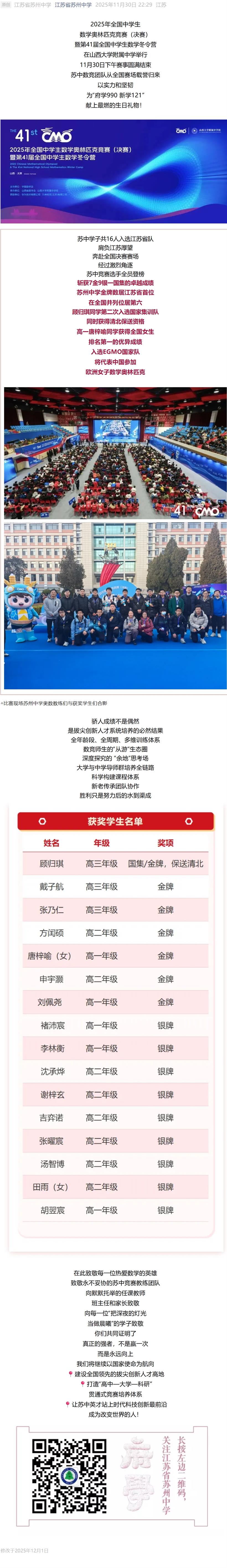 喜报!苏州中学数竞7金9银一国集,无上荣光,献礼府学990!