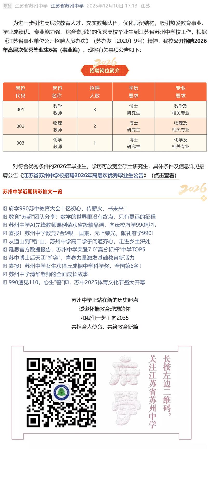 招聘 | 苏州中学6名事业编教师席位,邀你共赴2035教育新征程
