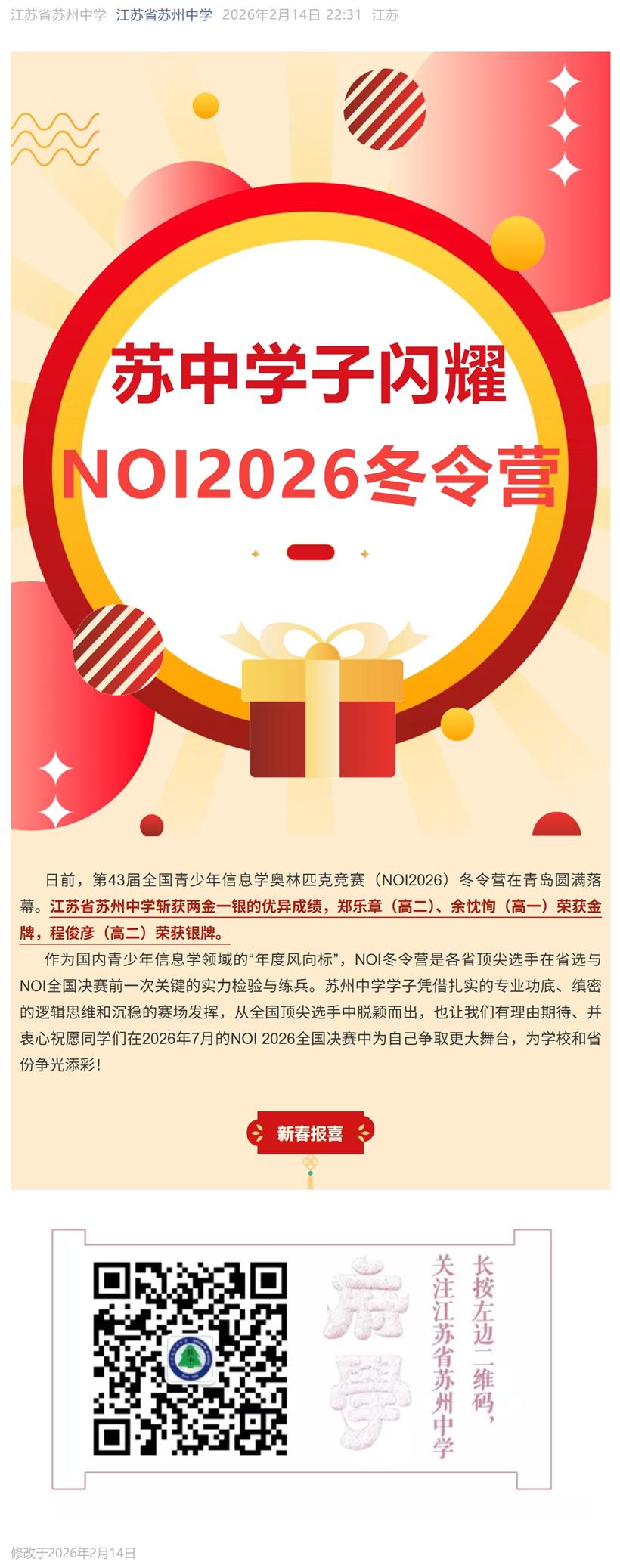 两金一银,苏中信奥学子闪耀NOI2026冬令营